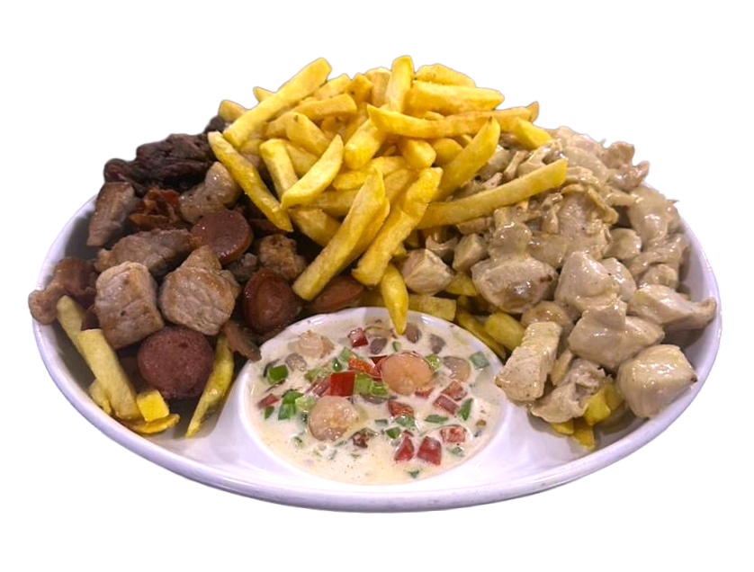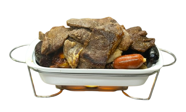 Para 2 Personas: 2 filetes de pechuga de pollo, 2 chuletas de cerdo, 2 trozos de lomo, 2 prietas, 2 chorizillos y 3 papas cocidas.